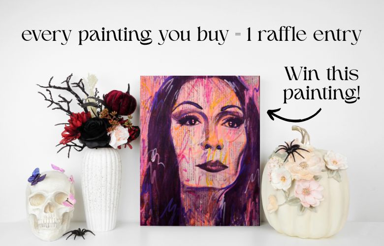 Every painting purchased enters you into a raffle to win my mixed media piece Cara Mia, inspired by Morticia Addams.