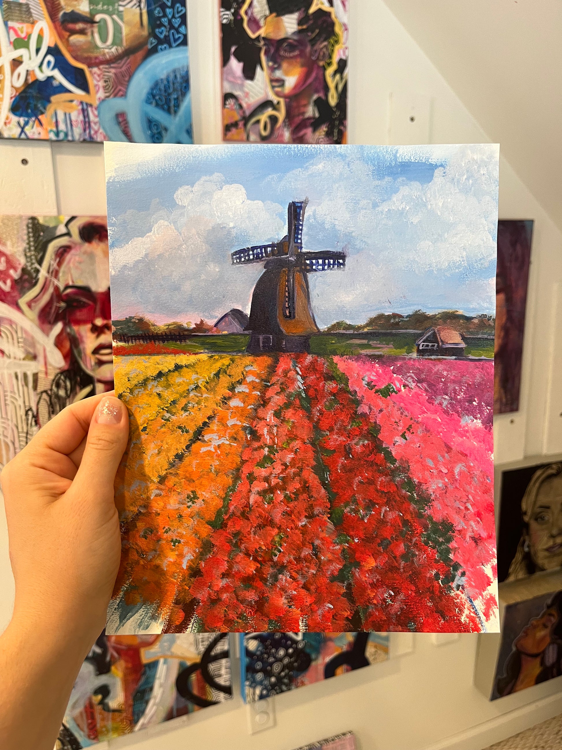 9x11" original acrylic painting of a windmill and rows of colorful flowers