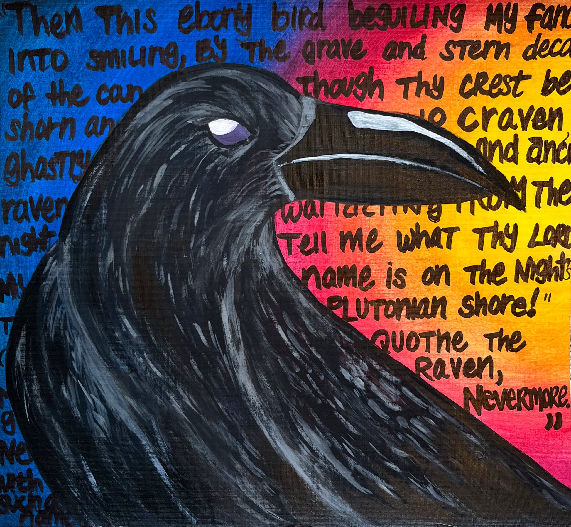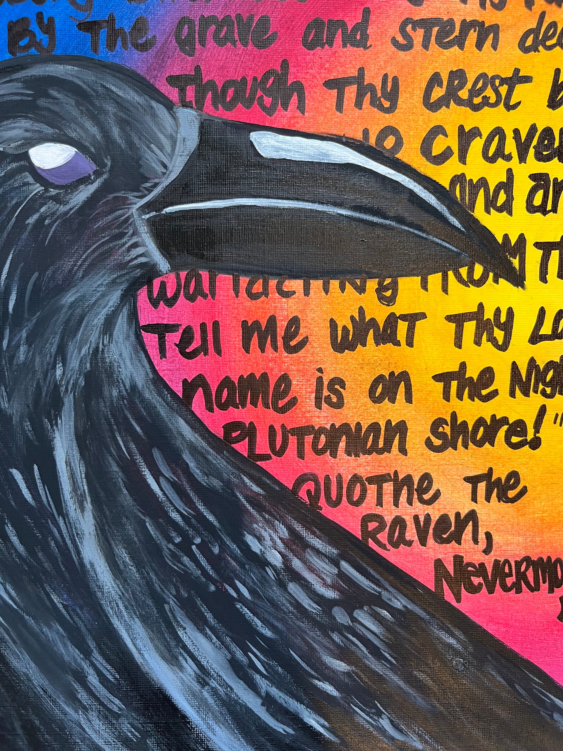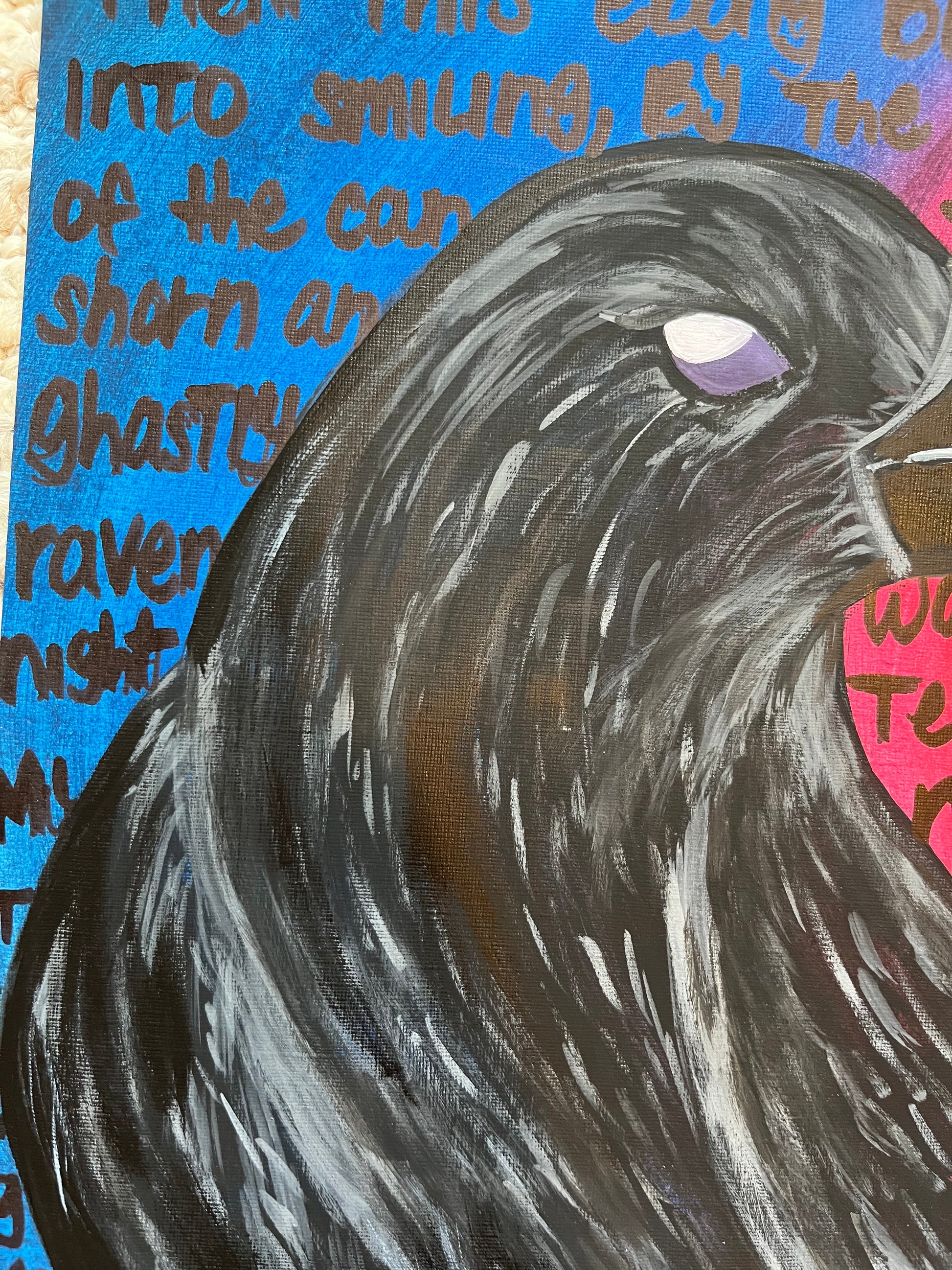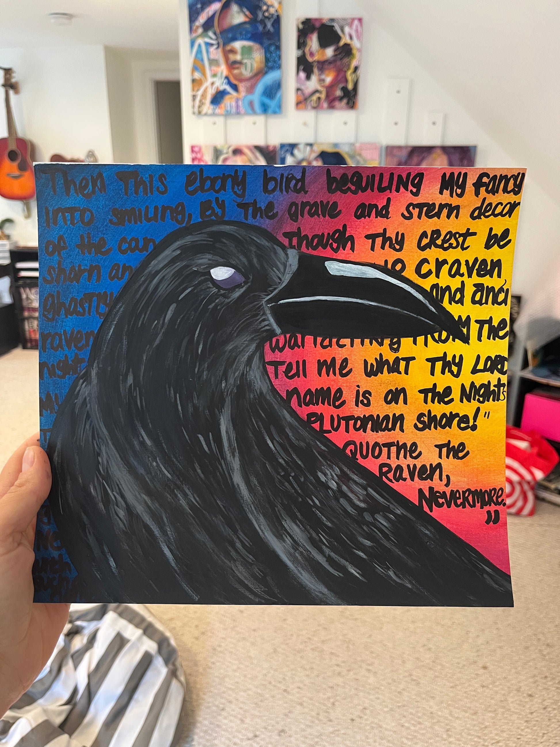 10x11" original painting of raven set against an excerpt from Edgar Allen Poe's The Raven, on paper