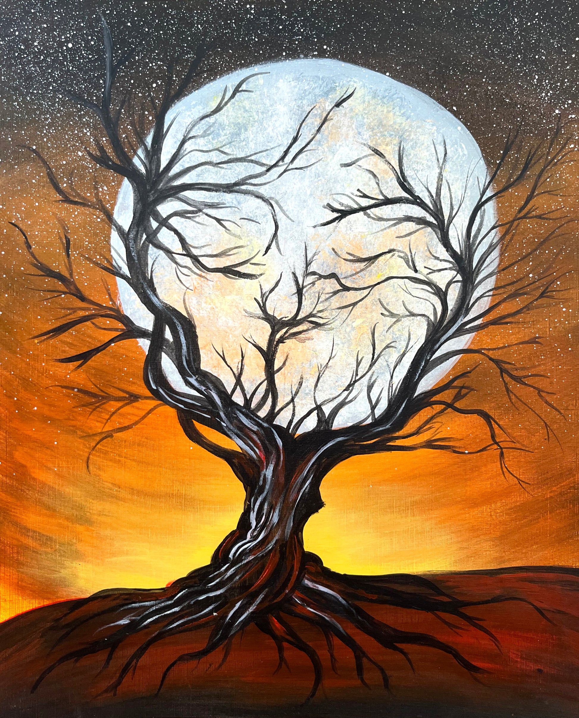 10x13" original painting of a tree creating the illusion of a skeleton face on paper