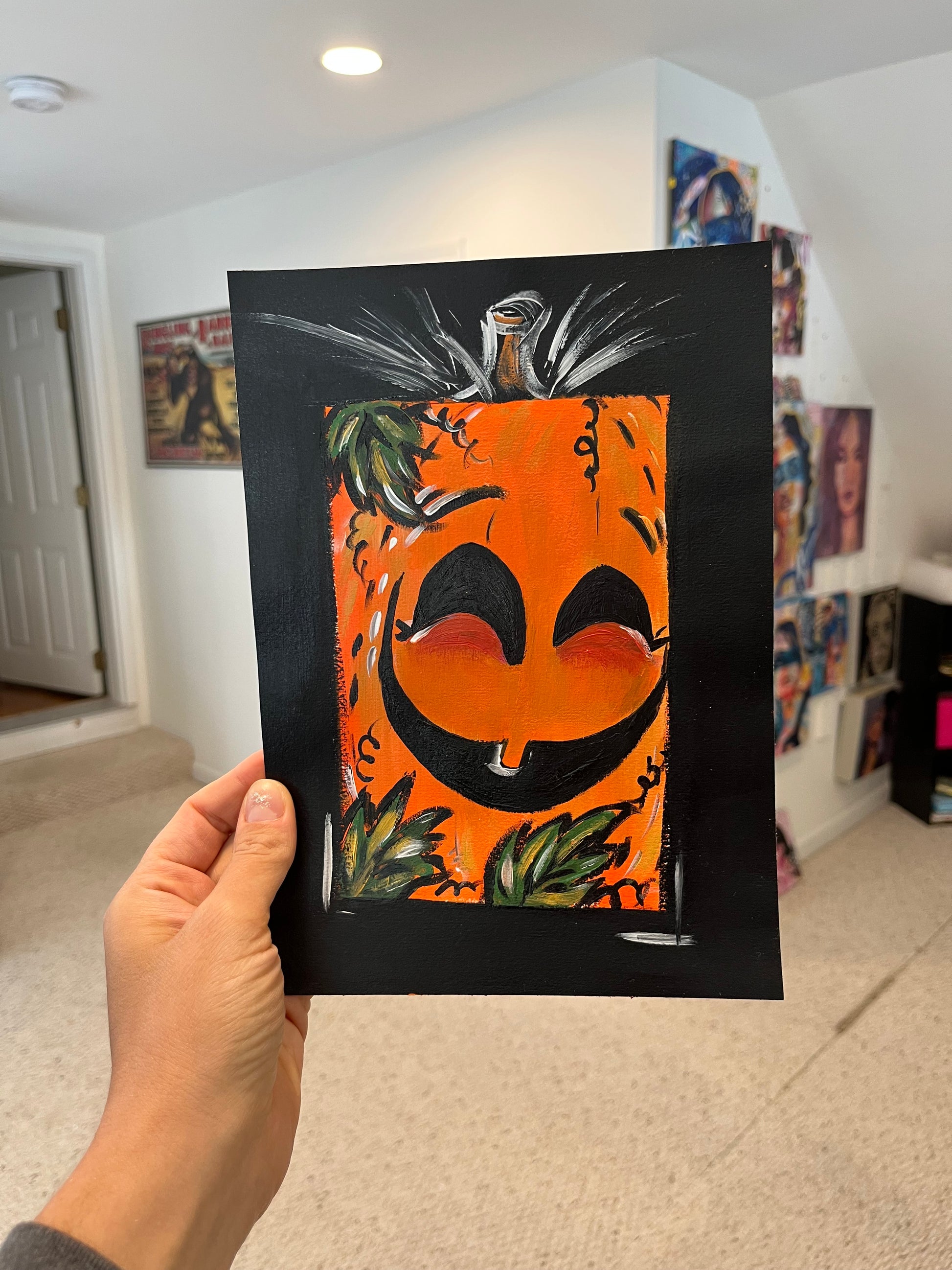 7x10" original painting of a Jack-o-lantern pumpkin, vintage style, on paper.