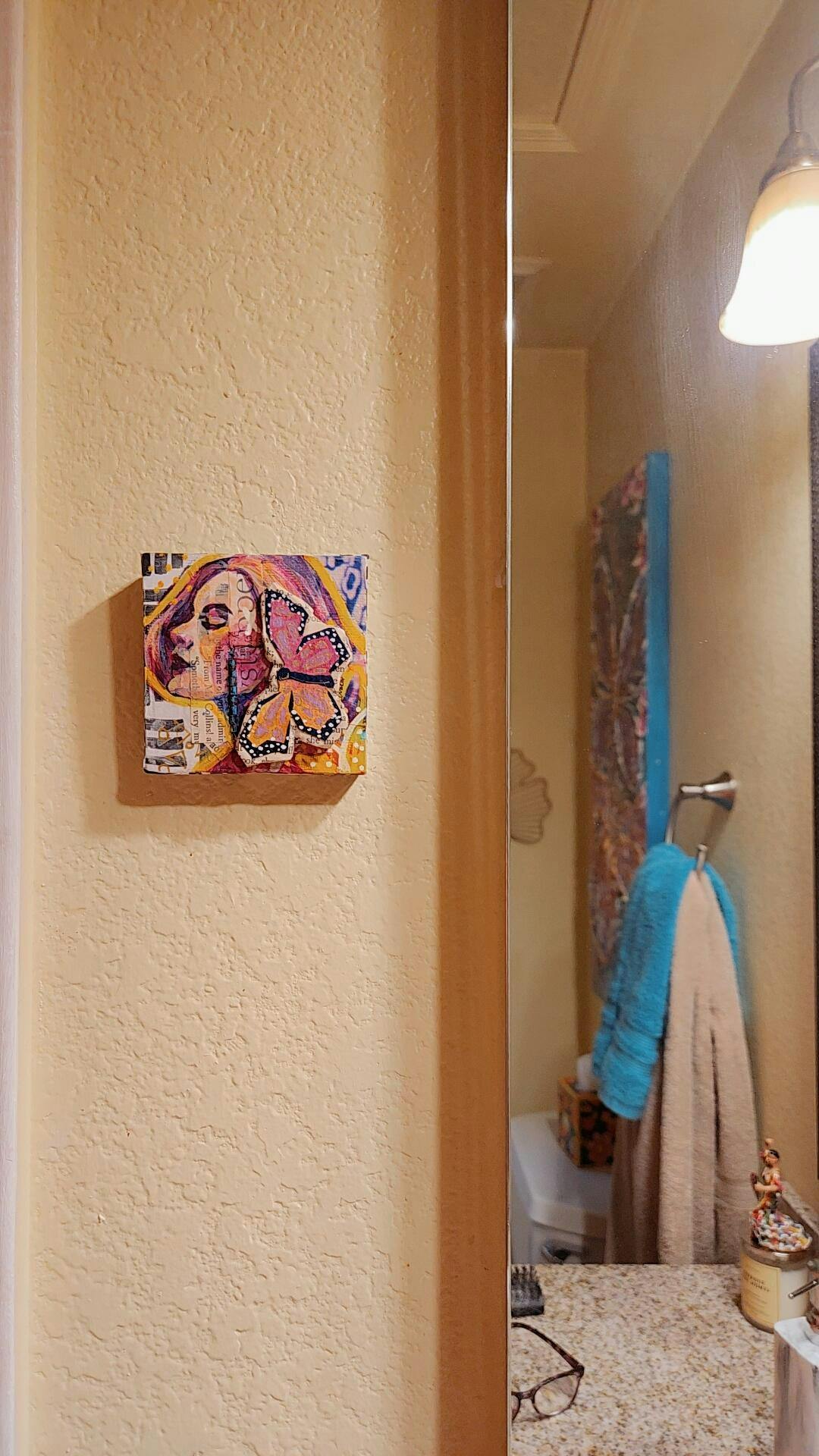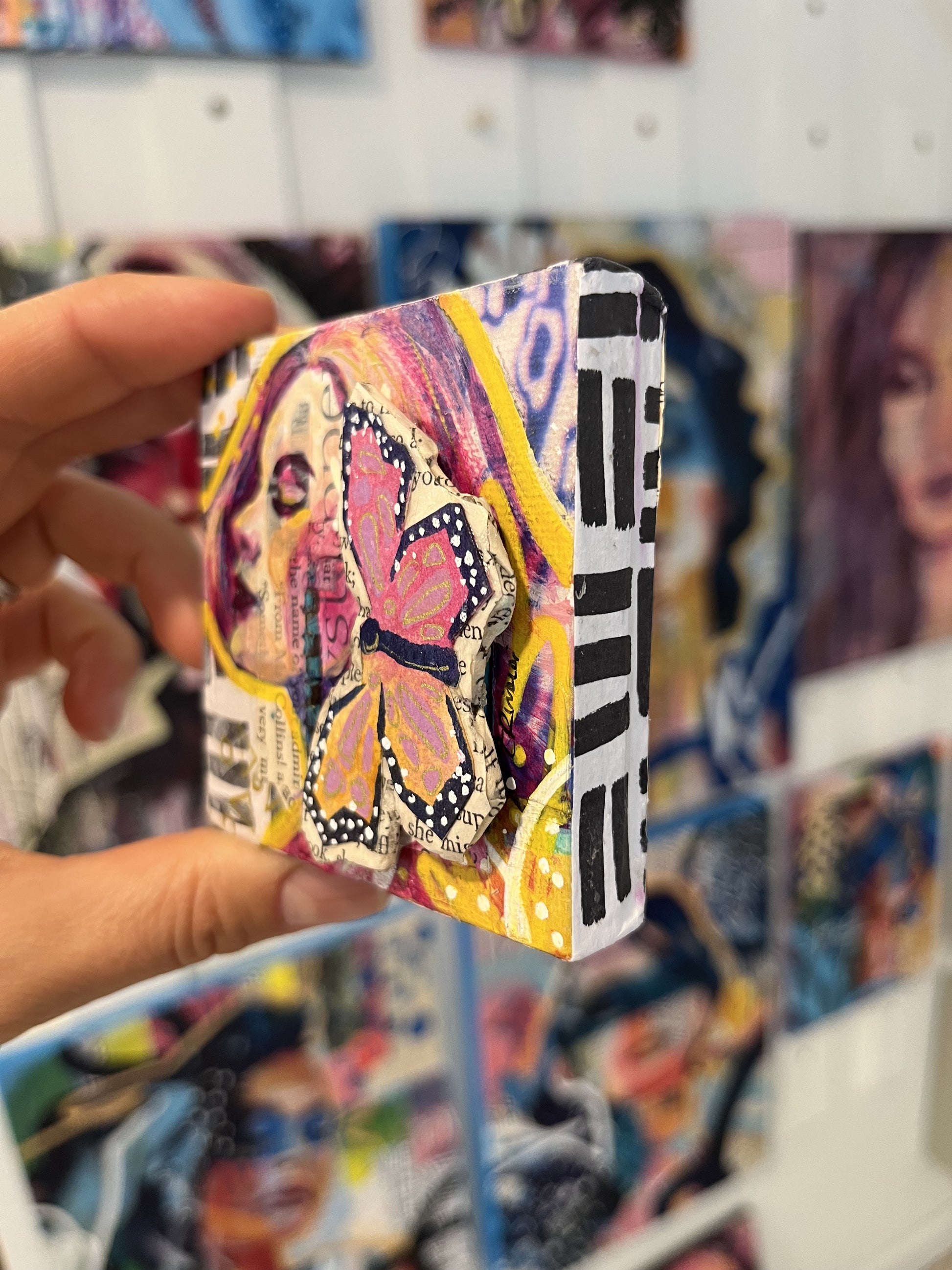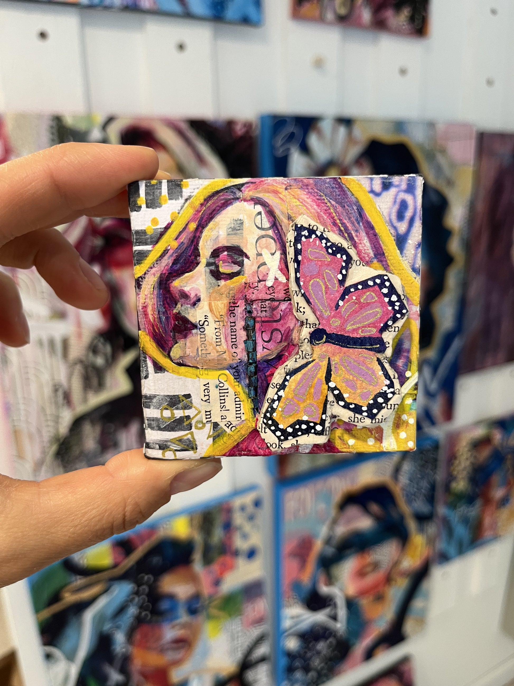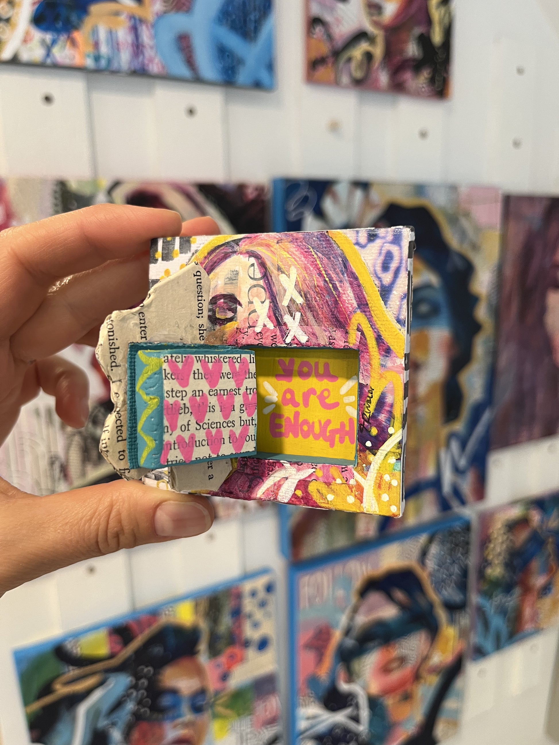 "You Are Enough"- 3”x3” acrylic mixed media painting on canvas with a secret hidden door displaying the message “You Are Enough”.