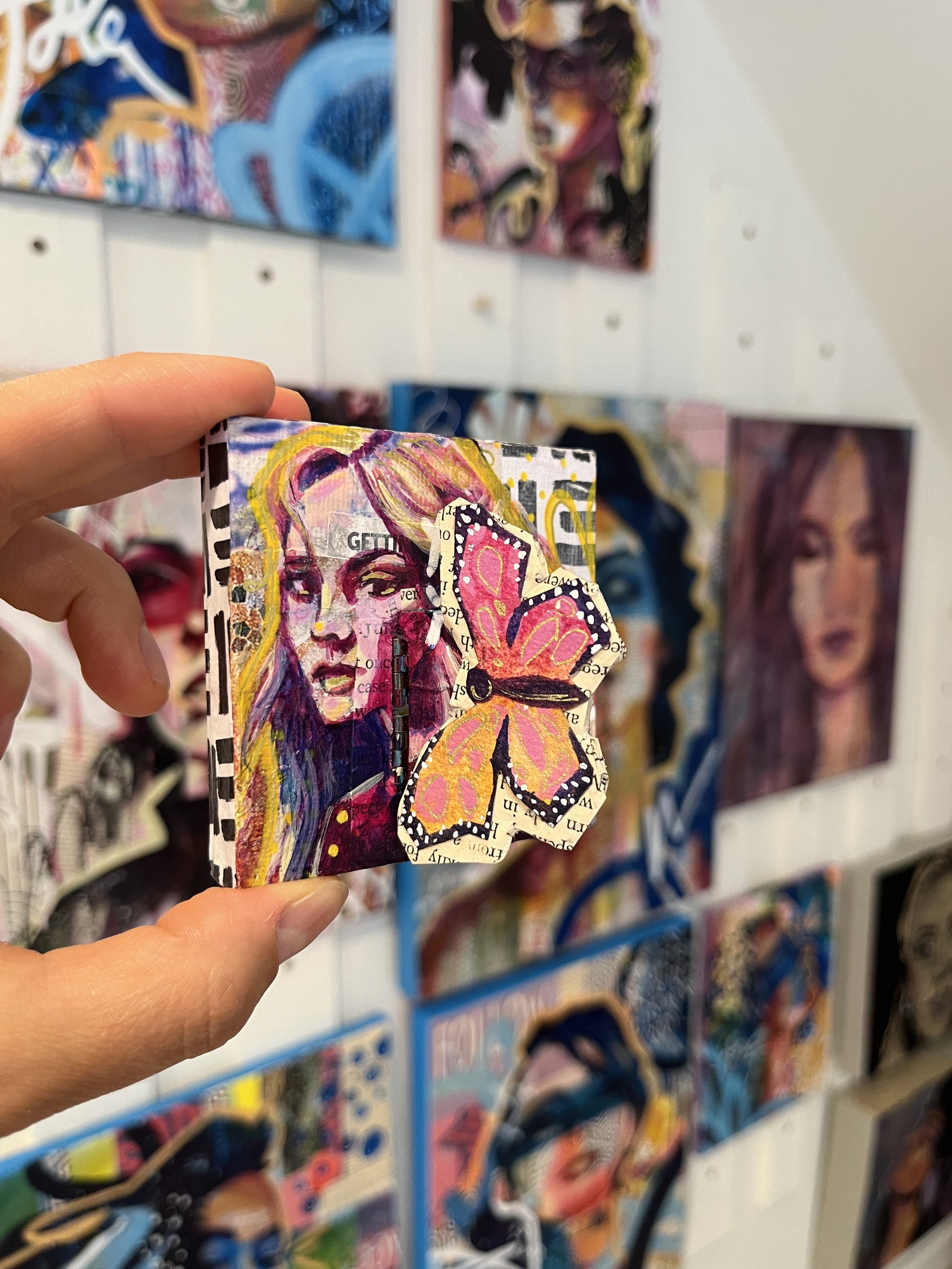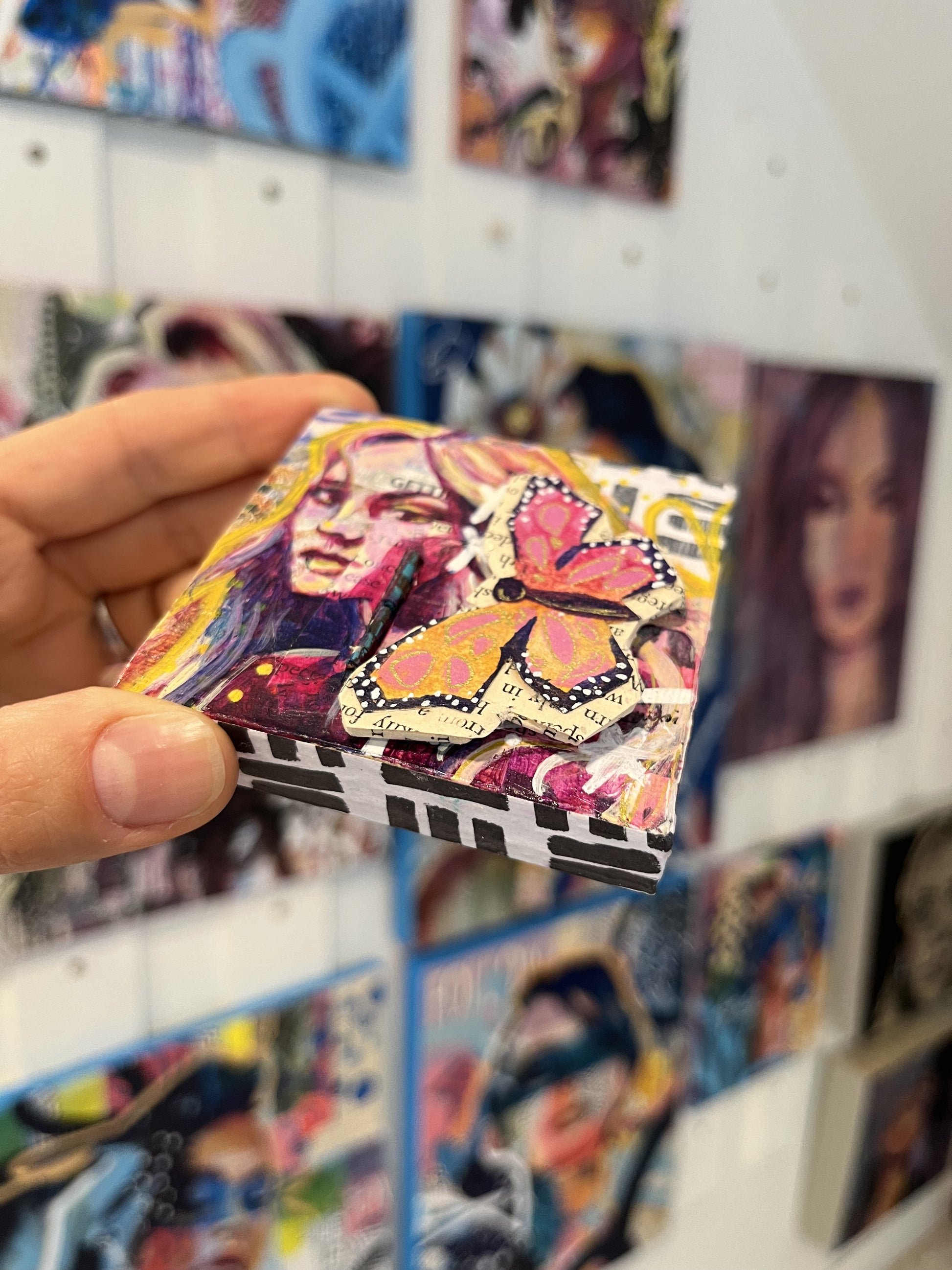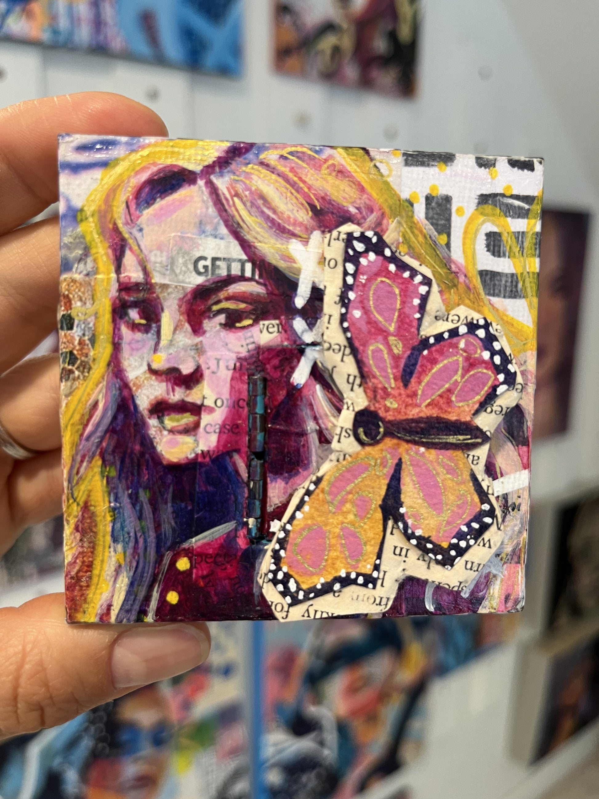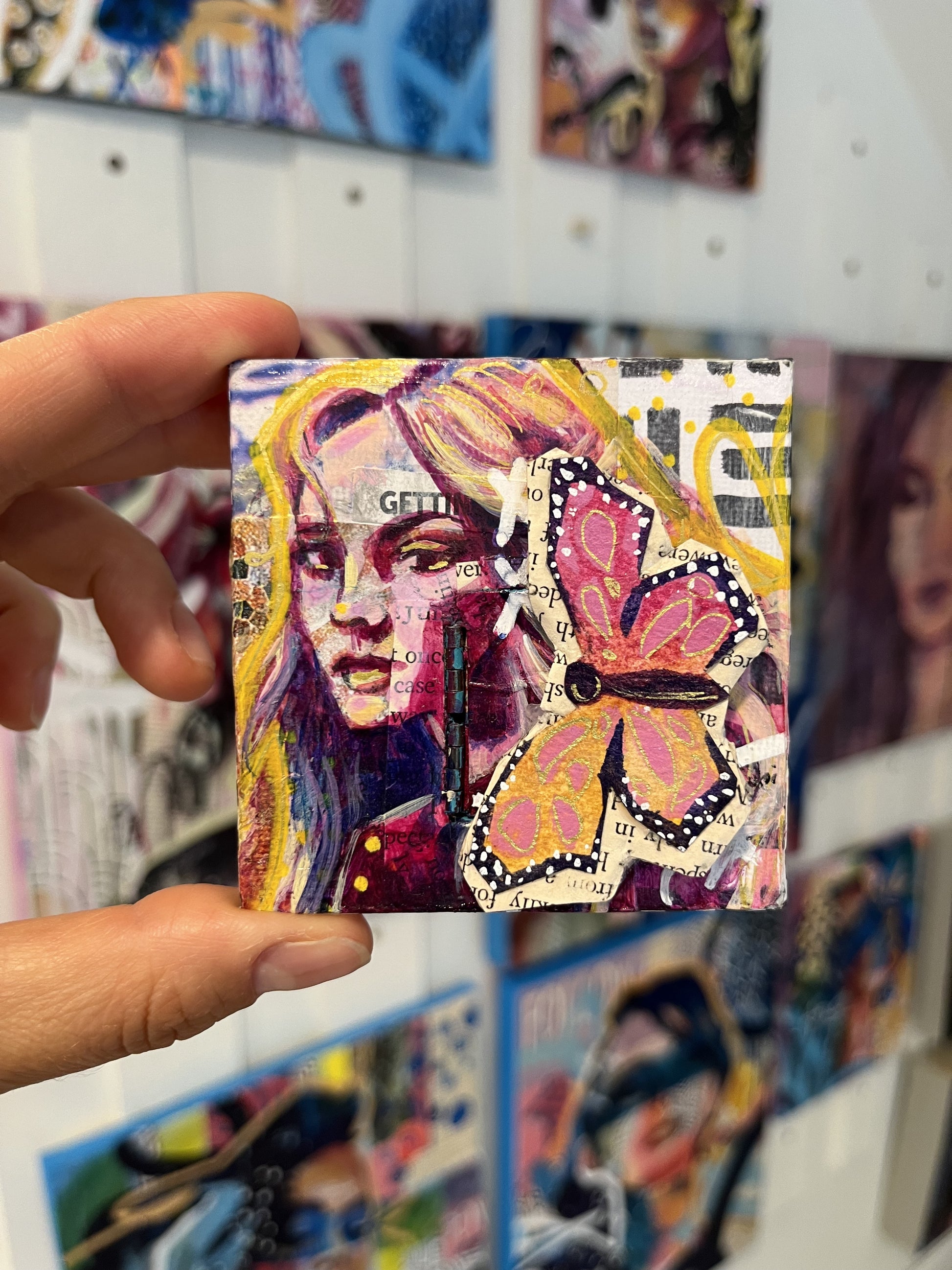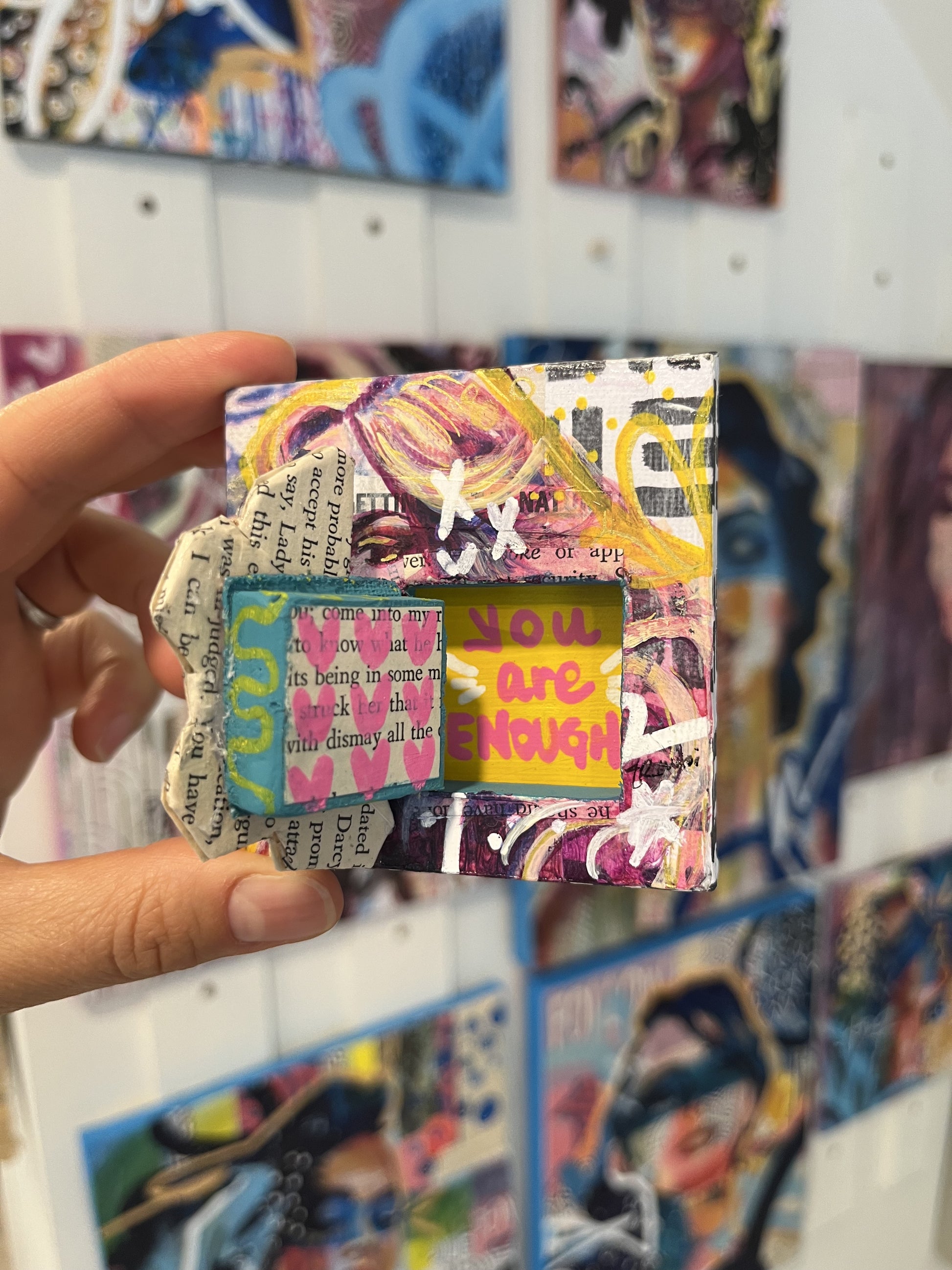 "You Are Enough"- 3”x3” acrylic mixed media painting on canvas with a secret hidden door displaying the message “You Are Enough”.