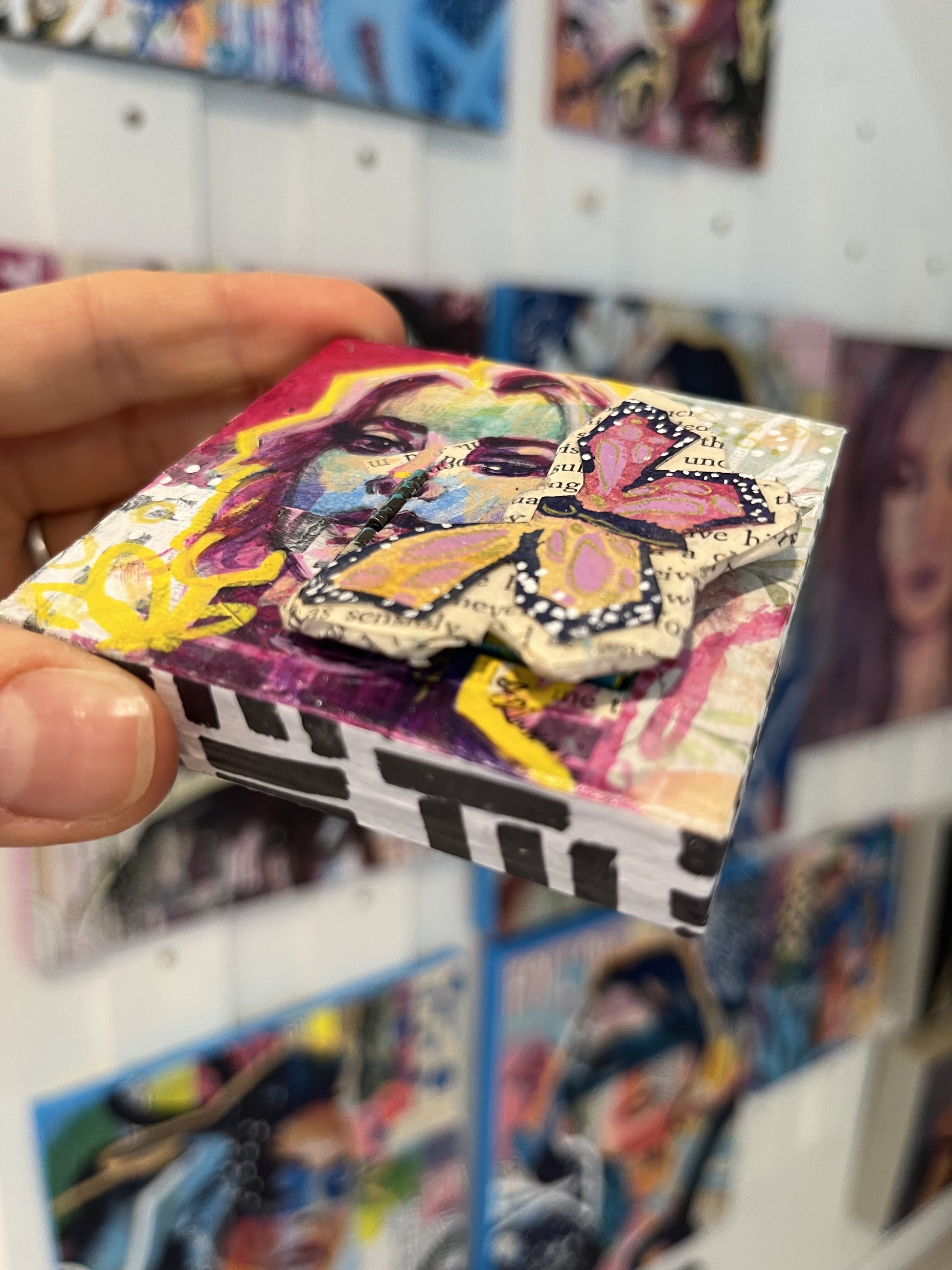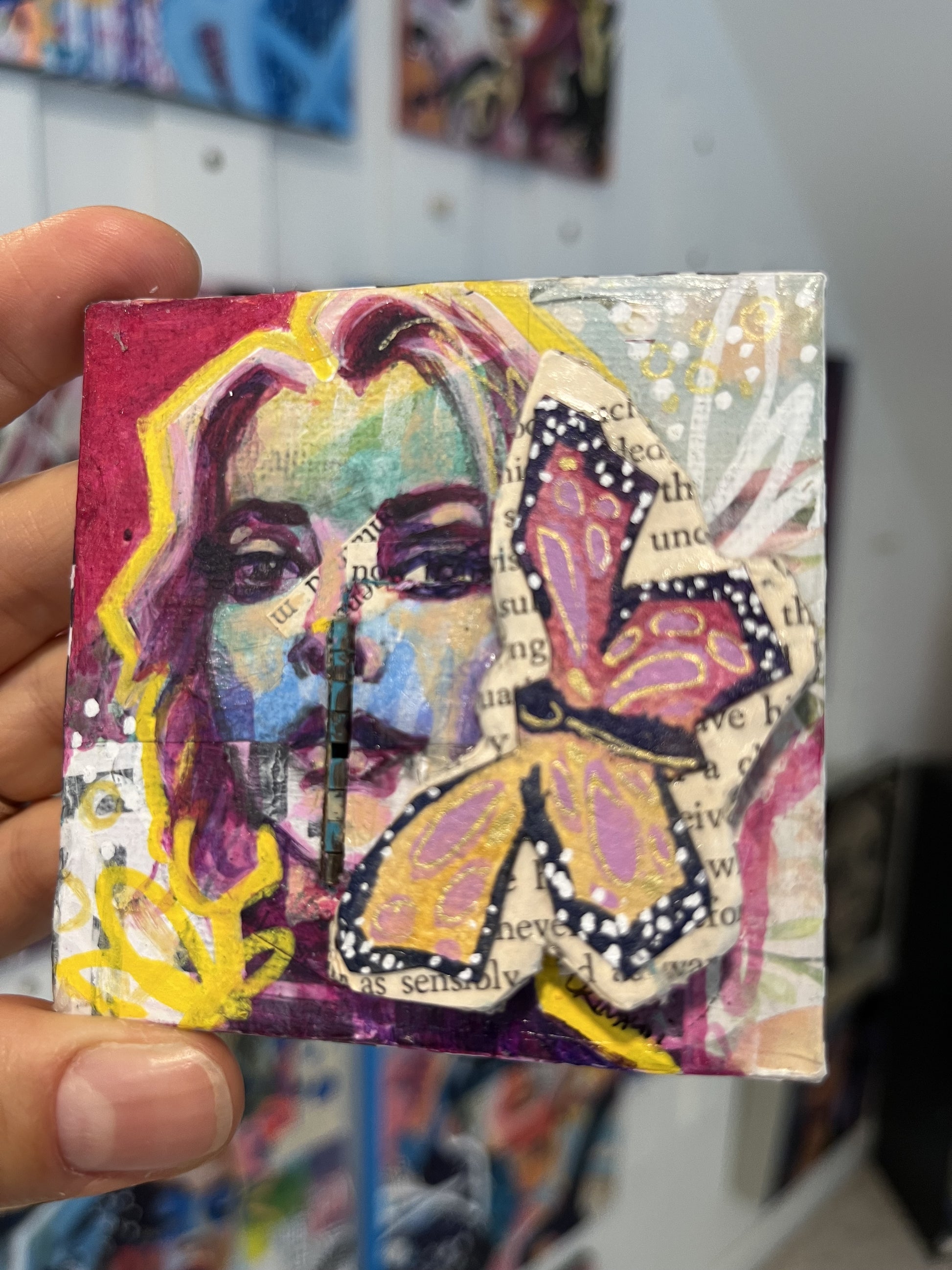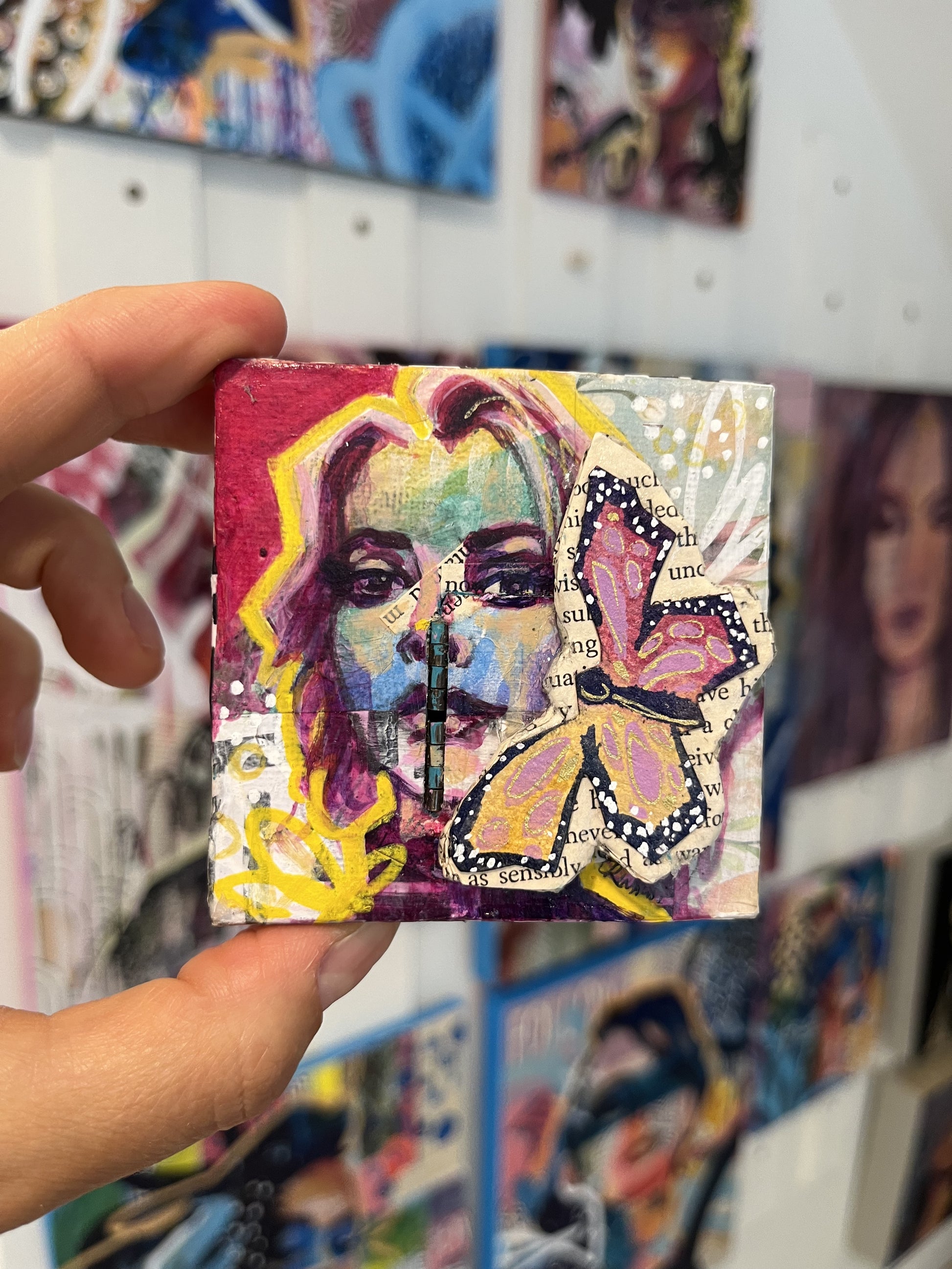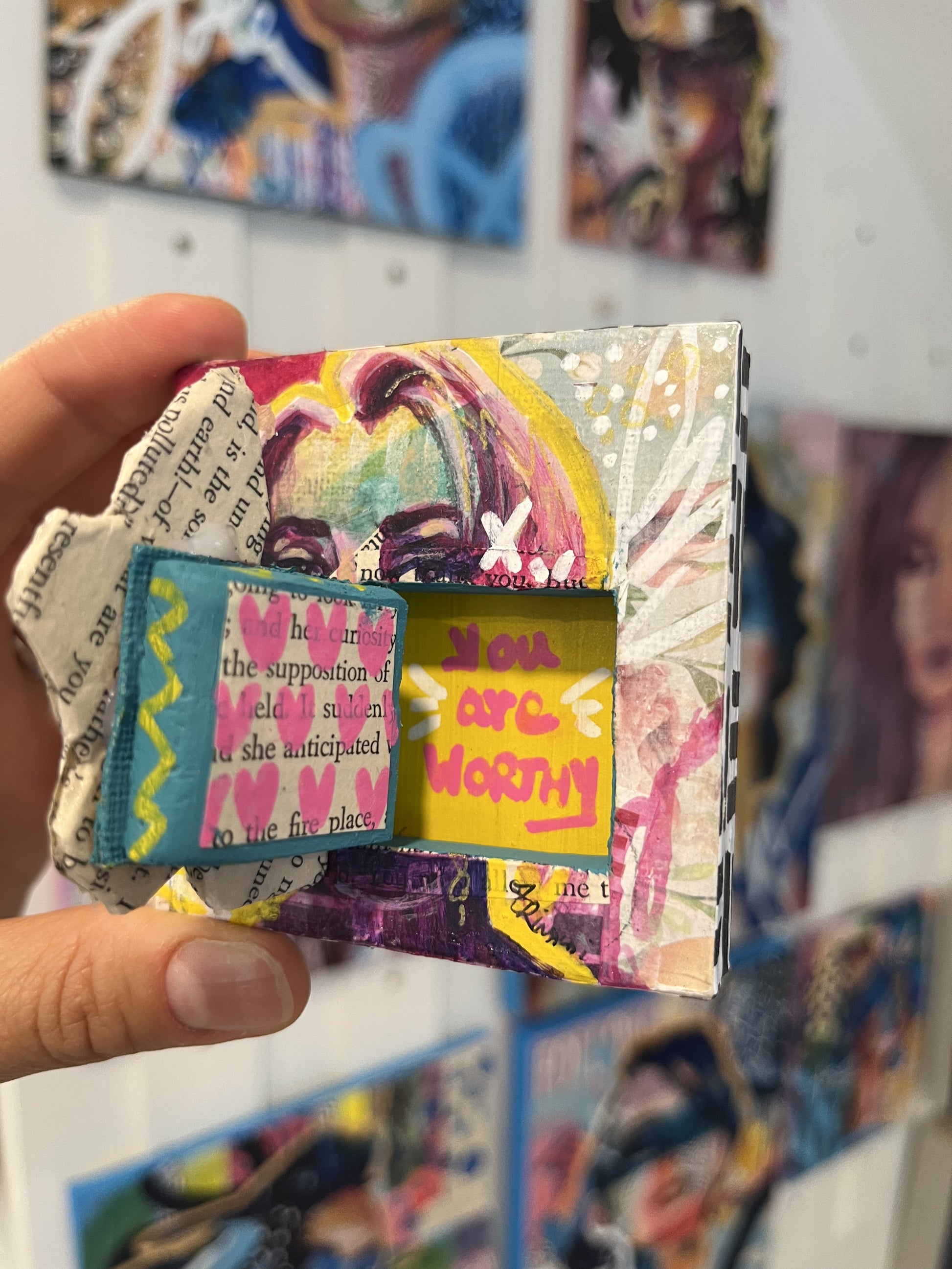 "You Are Worthy"- 3”x3” acrylic mixed media painting on canvas with a secret hidden door displaying the message “You Are Worthy”.